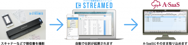 Streamedは、スマートフォンのカメラやスキャナーで領収書を読み取るだけで、オペレーターが手入力で正確にデータ化し、支払先の業種に応じて自動的に仕訳を起票することができるクラウド経費管理サービスです。Streamedで起票された仕訳データは、A-SaaSに取り込み可能なCSVファイルとして出力が可能です。