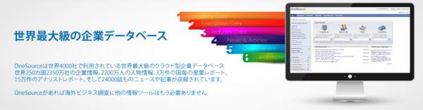『OneSource』 (http://onesource.co.jp/)は、世界2350万社の企業データ、2800万人の人物データ、200カ国197産業3万件の産業レポート、24,000の業界誌を含む世界最大級の企業データベースです。全世界の上場企業59000社、未上場企業2300万社の情報を日次・月次ベースで更新し、クラウド型のサービスとして提供しています。
