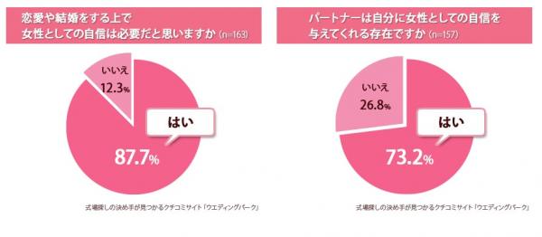 『恋愛や結婚をする上で女性としての自信は必要だと思いますか(単一選択)』という質問に、約9割の女性が「はい」と回答、また『パートナーは自分に女性としての自信を与えてくれる存在ですか(単一選択)』という質問には、7割以上の女性が「はい」と回答する結果となり、恋愛や結婚をする上で女性としての自信は重要で、また自信を与えてくれるパートナーとめぐり合うことで更に女性としての自信が持てることがわかりました。