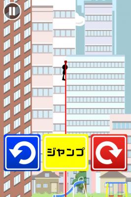 右左回転ボタンをリズムよくタップし、棒人間が前にとべるタイミングでジャンプボタンをタップできるかがポイントです。