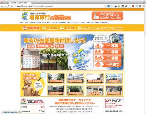 『有限会社サンサンホーム』様は東京都葛飾区亀有駅前に店舗を構える亀有専門の物件を扱う不動産会社です。賃貸、売買、投資、リフォームに関する業務をワンストップで対応しています。今回のリニューアルではファミリー層ユーザを対象にユーザビリティ向上をめざし、学区ごとに物件を選べる構成に変更しました。それにより詳細エリアでの検索ができるようになりパフォーマンスも向上しました。