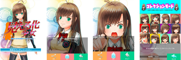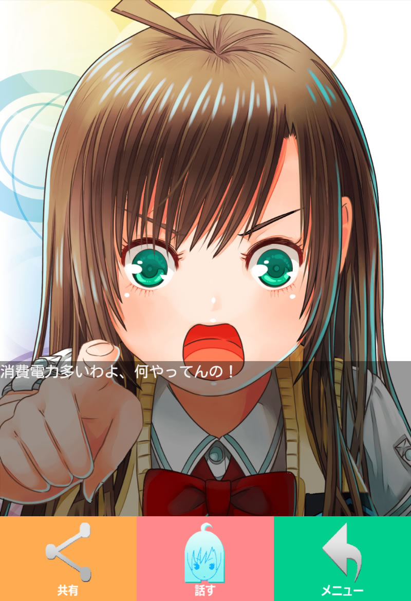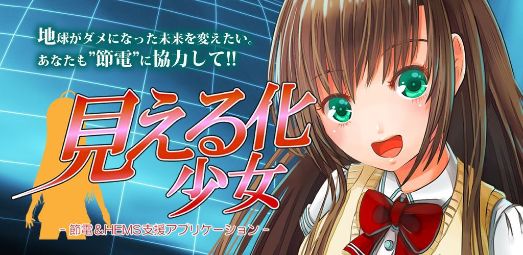 『見える化少女』は美少女ゲーム風の消費電力モニタリング&節電支援アプリです。アプリはAndroid 4.0以上対応(タブレット推奨)で、11月7日(金)よりGoogle Play Storeで無料ダウンロードが可能。内容は、資源エネルギーの枯渇した未来の地球を救うためユーザー様の端末にタイムリープしてきたツンデレ美少女の映(はゆ)ちゃんが、アプリを通してユーザー様に省エネを促すというもの。アプリにはあらかじめ3種類の異なる消費電力ログがサンプル家庭データとしてインストールされているため、ユーザー様は3つの中から1つを選んですぐにプレイ開始できます。過去の消費電力量に応じて喜んだり怒ったりする映ちゃんとコミュニケーションしながら、ぜひ、節電へのチャレンジを疑似体験してください。面白いセリフや嬉しいセリフが登場した際に画面キャプチャしてTwitterで共有する機能や、そうしたセリフをアーカイブとして保存しいつでも再生できる「コレクションモード」も搭載しています。
