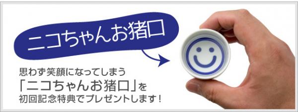 さらに、今回のサービス開始の初回特典として「ニコちゃんお猪口」をプレゼントでお付けします。利き猪口タイプの酒器で、通常青丸が描かれる酒器の底にはスマイルのデザインが施され、飲む方の笑顔を誘う楽しいお猪口です。