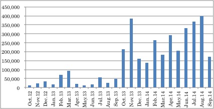 Scutumによる攻撃検知数(2012年10月~2014年9月)※グラフの単位は件