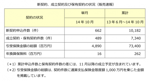 2014 年 10 月の新契約申込件数は 662 件となり、10 月末の累計申込件数は1万 182 件