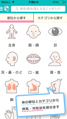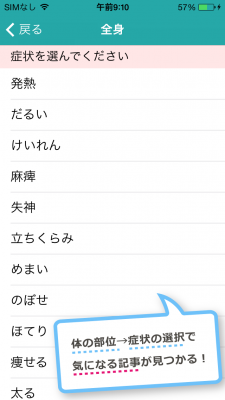目、胃・腹部、背中・腰など12のカラダの部位から選択、よくある症状や状態を指定し記事を探すことが出来ます。