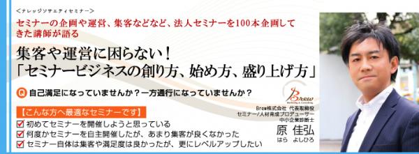 2014年11月20日(木)、セミナープロデュース事業を手掛けるBrew株式会社 代表取締役の原佳弘(はらよしひろ)氏をスピーカーに招き、セミナーを開催します。