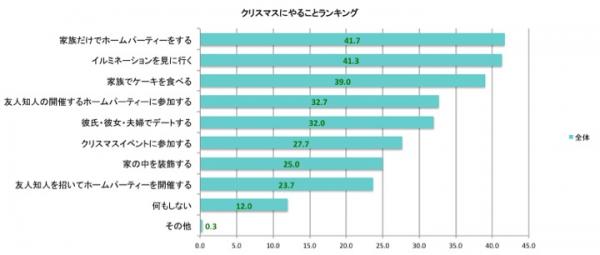 クリスマスにやりたいことを聞いたところ、1位は「家族でホームパーティー」(41.7%)、次いで「イルミネーションを見に行く」(41.3%)、「家族でケーキを食べる」(39.0%)、「友人知人の開催するホームパーティーに参加する」(32.7%)が続くという結果になりました。