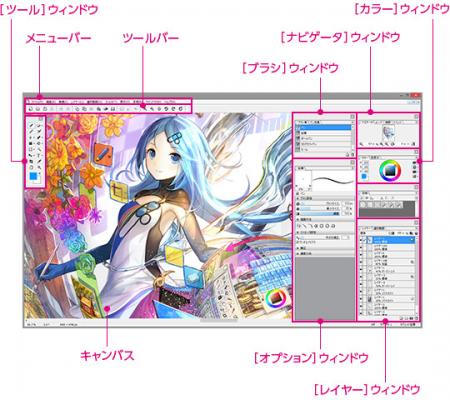アナログで描いたような描き味のペン、シンプルで分かりやすいインターフェイスなどのイラスト制作に関わる基本性能の高さと、描画手順を記録 / 再生する「openCanvas」独自の [イベント機能] と 10人のプロ絵師のメイキングや「イラスト制作のお役立ちテクニック集」が掲載された書籍により、初心者でも制作作業を始めることが可能。