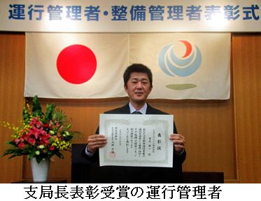 今回の受賞は、大手スーパーを主要顧客とする東扇島支店の車両約50台の運行管理業務において5年間以上の期間に亘って事故や違反に運行管理上の責任が無い、勤務状況が優良であるなど安全確保に取り組んでいることが評価されたものです。