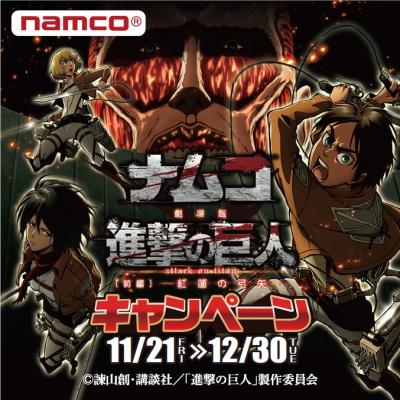 株式会社ナムコ(本社:東京都港区)は、2009年より別冊少年マガジンにて連載中の大人気作品「進撃の巨人」の劇場版である、『劇場版「進撃の巨人」前編~紅蓮の弓矢~』の公開を記念し、全国直営アミューズメント約130店舗で、2014年11月21日(金)から12月30日(火)の日程で『ナムコ×劇場版「進撃の巨人」前編~紅蓮の弓矢~』キャンペーンを開催します。