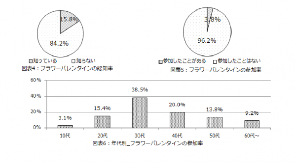 続いて、花き関係者で組織されるフラワーバレンタイン推進委員会が、男性向けに2011年から消費拡大を目的に取り組んでいる「フラワーバレンタイン」の影響を調べるために、認知率・参加率(受け取った経験も含め)について尋ねてみたところ、認知率は15.8%となり(図4)、男女別では男性14.0%、女性17.3%となった。参加率は3.8%となり(図5)、年代別では30代が最多(38.5%)となった。(図6) フラワーバレンタインが日本の代表的イベントとして定着し、消費拡大という目的を達成するためには、まだ時間がかかるようだ。