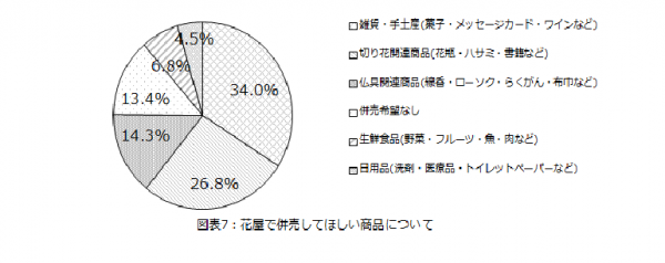 最後に、フラワーショップで併売してほしいものについて尋ねてみると、「雑貨・手土産」が34.0%と最多となり、次いで「切り花関連商品」が26.8%となった。(図表7)