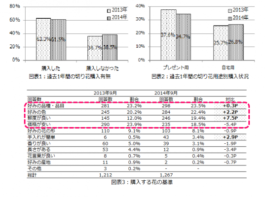 そして、過去1年間で花を購入した回答者に対して、用途別購入状況を確認すると「プレゼント用に買う機会が多かった」34.7%、「自宅用に買う機会が多かった」26.8%となった。(図表2) また、購入する花の基準について尋ねてみると、「好みの品種・品目」が23.5%と最多となった。前回最多であった「価格が安い」は昨年から5.4ポイントと最も減少した。(図表3) この1年で消費者の購買傾向は、価格重視から好み重視へと変化したことが分かる。花の購買において、2014年4月の消費増税の影響は小さいようだ。