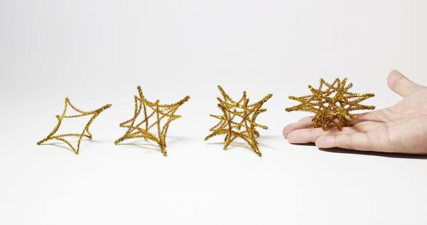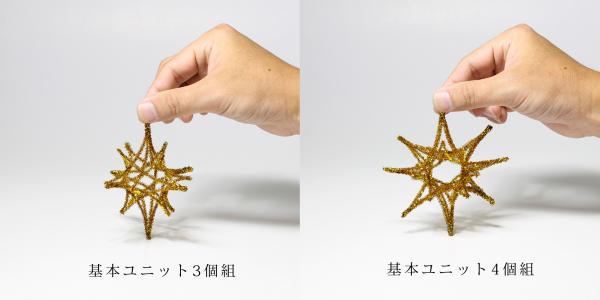 モールヒンメリ工作キットの対象年齢は小学生低学年から。子どもでも約15分~30分ほどで完成します。使う道具はぶら下げるために糸を好みの長さで切る時に使うハサミのみで、ヒンメリの基本ユニットとなる多面体は手だけで仕上げていきます。途中でモールを切ったり、ボンドを使わなくても仕上げることができるように作り方を工夫。また基本ユニットを複数組み替えることで様々な形にアレンジすることもできるようになっています。
