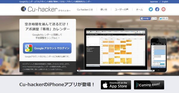 Cu-hackerとは「ビジネスマンの1日を30分増やす」ことを目指した、スケジュール調整専用カレンダーです。Googleカレンダーと同期し、カレンダーの空いた時間をクリックするだけで簡単にスケジュール調整用のメッセージを作成する事ができます。また、仮予定の登録/管理もできるので、ダブルブッキングの心配もありません。営業マンの強い味方、それがCu-hackerです。