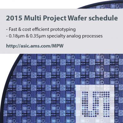 2015年amsは、長期にわたり連携しているCMP、Europractice、Fraunhofer IISおよびMosisなどのパートナーにより、全体でおよそ150のMPWを行います。日本のお客様も、ローカルMPWプログラムパートナーである株式会社トッパン・テクニカル・デザイン・センター (TDC)を介して参加することが可能です。