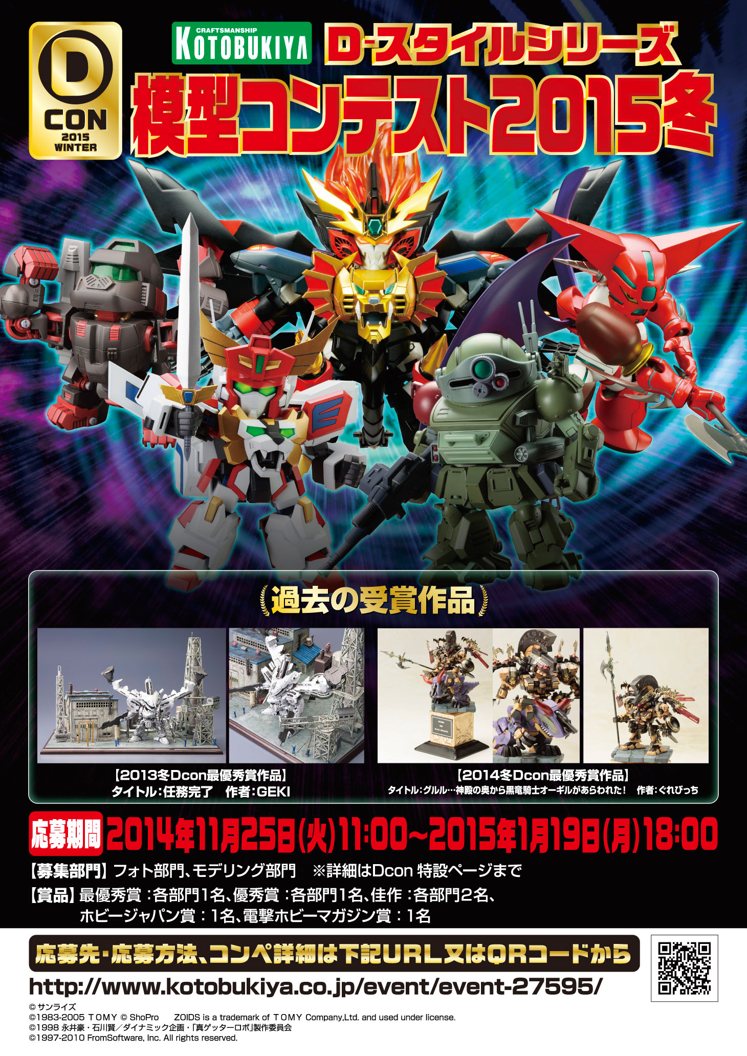 ホビーメーカー株式会社壽屋(本社:東京都立川市曙町/ 代表:清水一行)は、コトブキヤプラキット「D-スタイル」シリーズ作品コンテスト「D-スタイルシリーズ模型コンテスト2015冬」こと、「Dcon2015冬」を開催いたします。