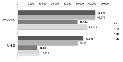 図1は、ファッションと化粧品に対する年間平均購入金額を比較したグラフになります。