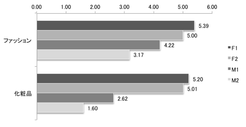 図2は、ファッションと化粧品に対する年間平均購入回数を比較したグラフになります。