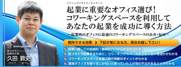 起業家向け会員制シェアオフィス・コワーキングスペース「KSフロア」を運営する株式会社ナレッジソサエティ(本社:東京都千代田区、取締役社長:久田敦史 http://www.k-society.com)は、「起業リスクを減らして起業を支援」という目的のもと、2014年12月2日(火)に「起業に重要なオフィス選び!コワーキングスペースを利用してあなたの起業を成功に導く方法」セミナーを開催します。