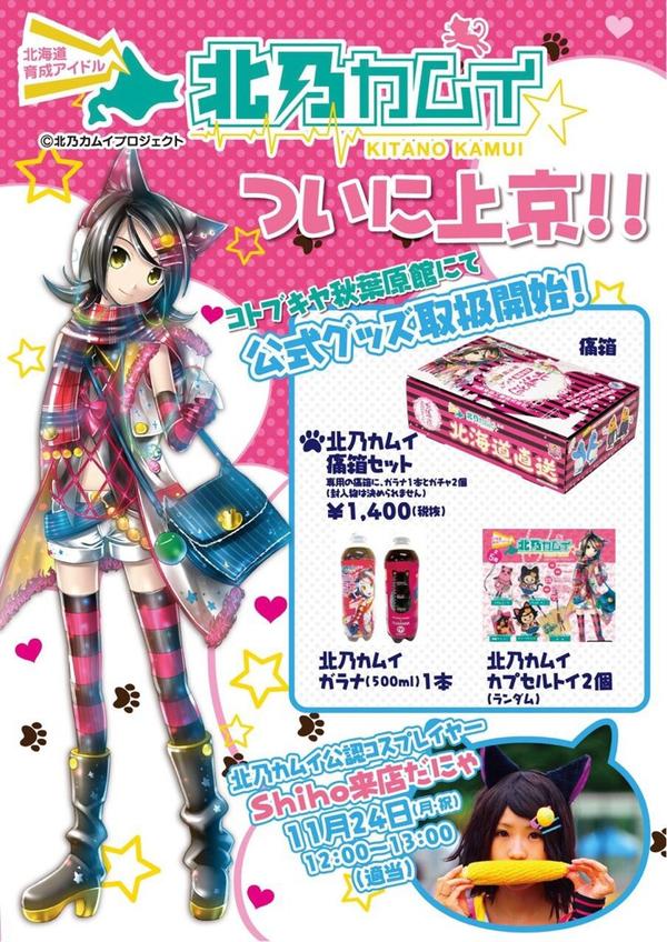 デザインを人気イラストレーターKEI氏が担当し、地元北海道をPRするキャラクターとして活躍中の「北乃カムイ」。北海道以外でのグッズの取り扱いは今回が初となります。取り扱い商品は、「北乃カムイ 痛箱セット」「北乃カムイ ガラナ」「北乃カムイ カプセルトイ」の3種。さらに11月24日(月・祝)12:00~13:00には、「北乃カムイ」公認コスプレイヤー・Shihoさんも来店します。