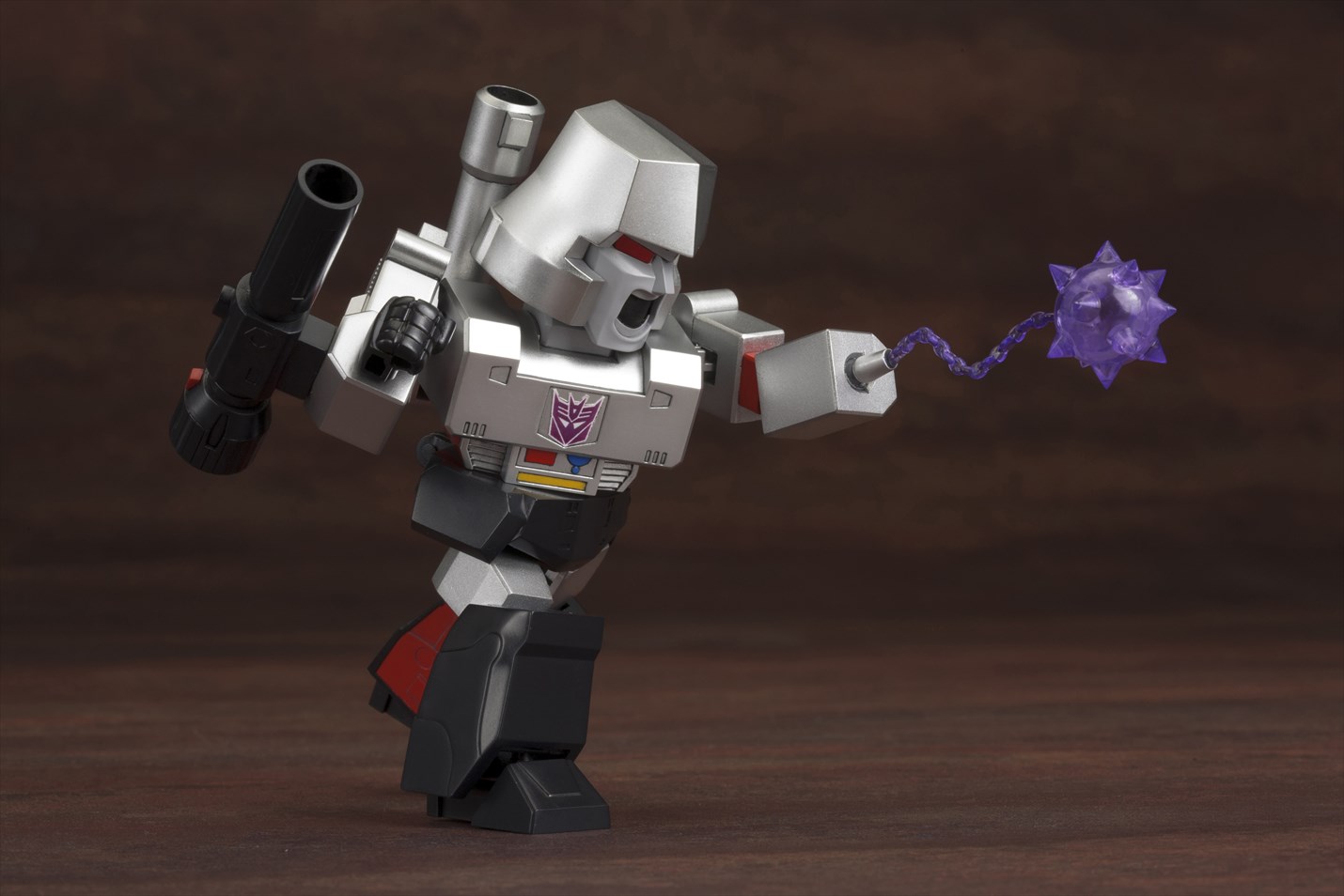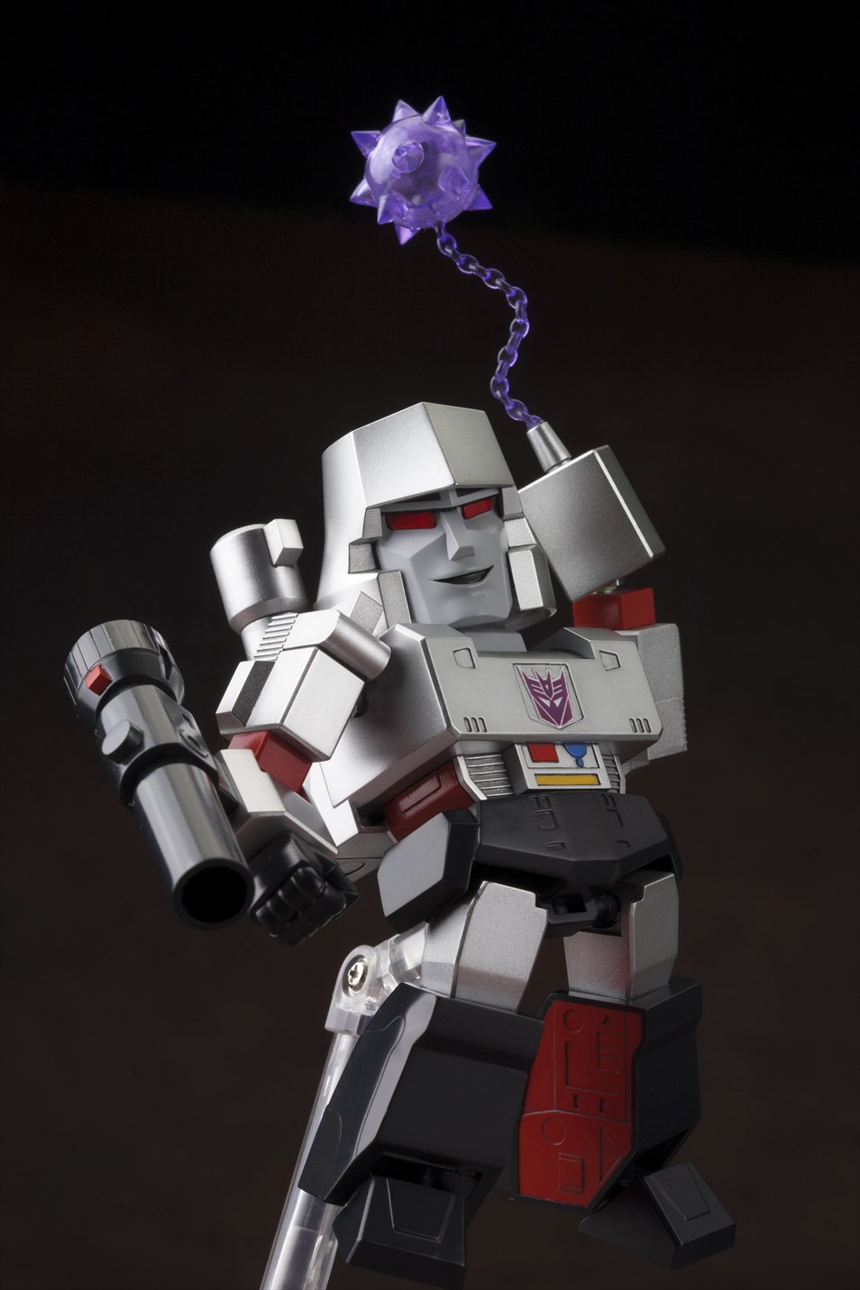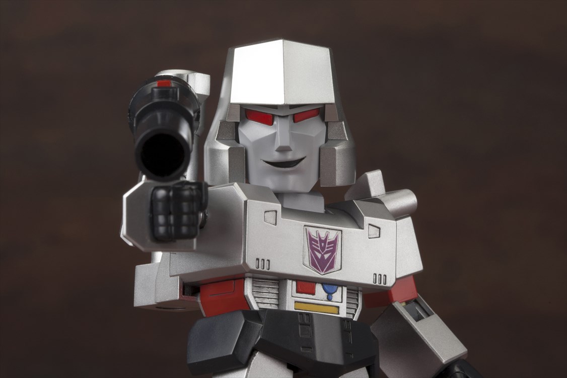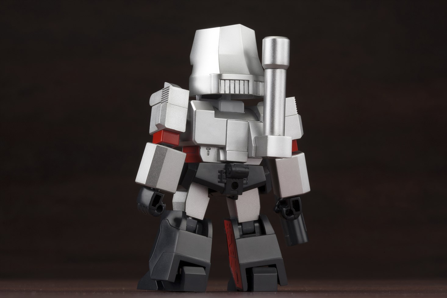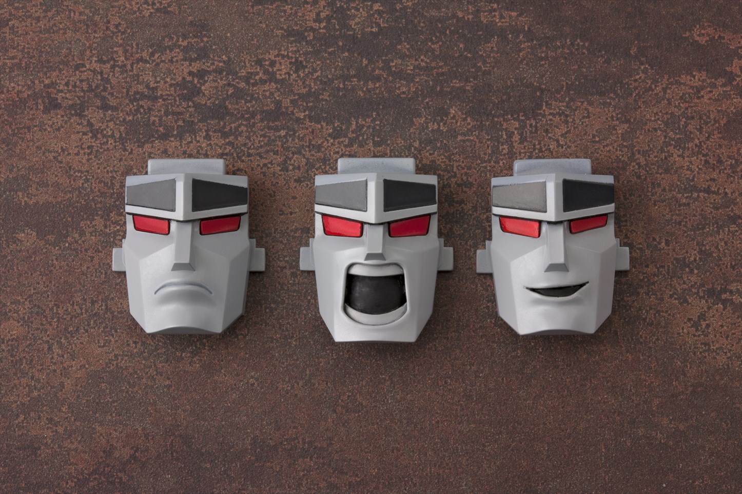 「コンボイ」同様、小さくかわいいサイズにアレンジしながらアニメイメージを損なうことなく立体化しました。通常の凛々しい顔の他に「スタースクリーム」に対して怒っている時の“叫び顔”や、悪巧みをしている時の“ニヤリ顔”など豊富な表情でお楽しみいただけます。さらにボディのメインカラーである銀部分は塗装済みの仕様につき、高級感のある仕上がりに。「メガトロン」の象徴的武器である「融合カノン砲」は設定画通りの取り付け方の他、可動を重視した取り付け方をお選びいただけます。「コンボイ」のエナジーアックスと対をなす「エナジーメイス」はクリアーパーツを採用、オープニングムービーでの決闘が再現できます。トランスフォーム後のガンモードが付属しているので「コンボイ」に持たせて共闘シーンを再現することも可能です。デストロンマークは付属のシールを貼ることで再現できます。「メカニカルベース フライング3」にも対応しているので様々なシチュエーションでディスプレイをお楽しみいただけます。