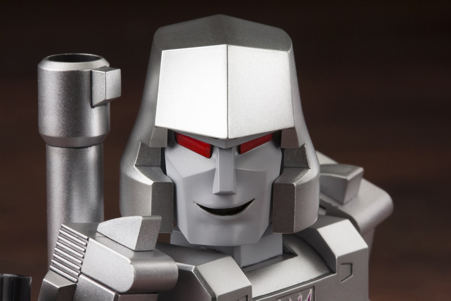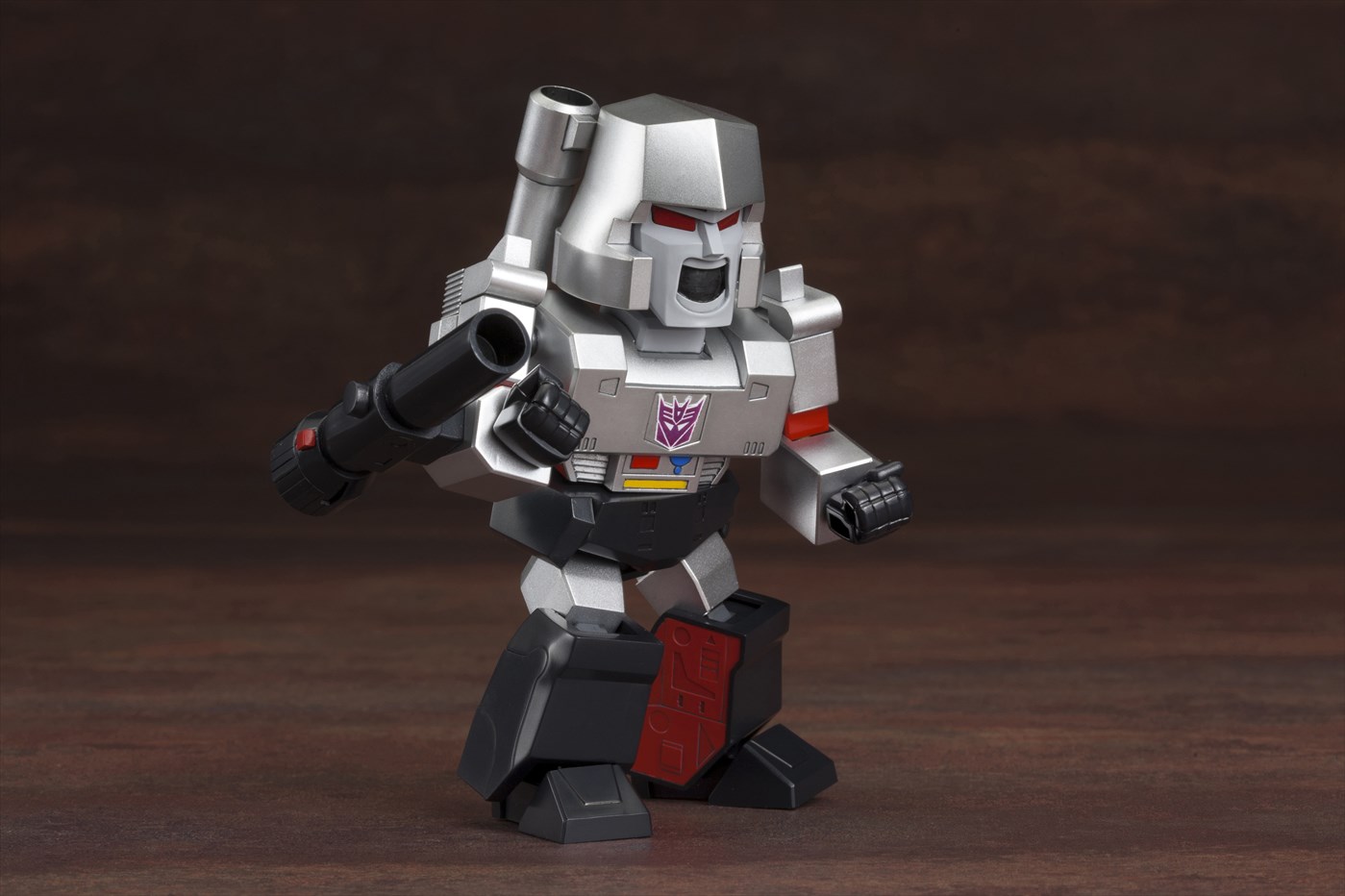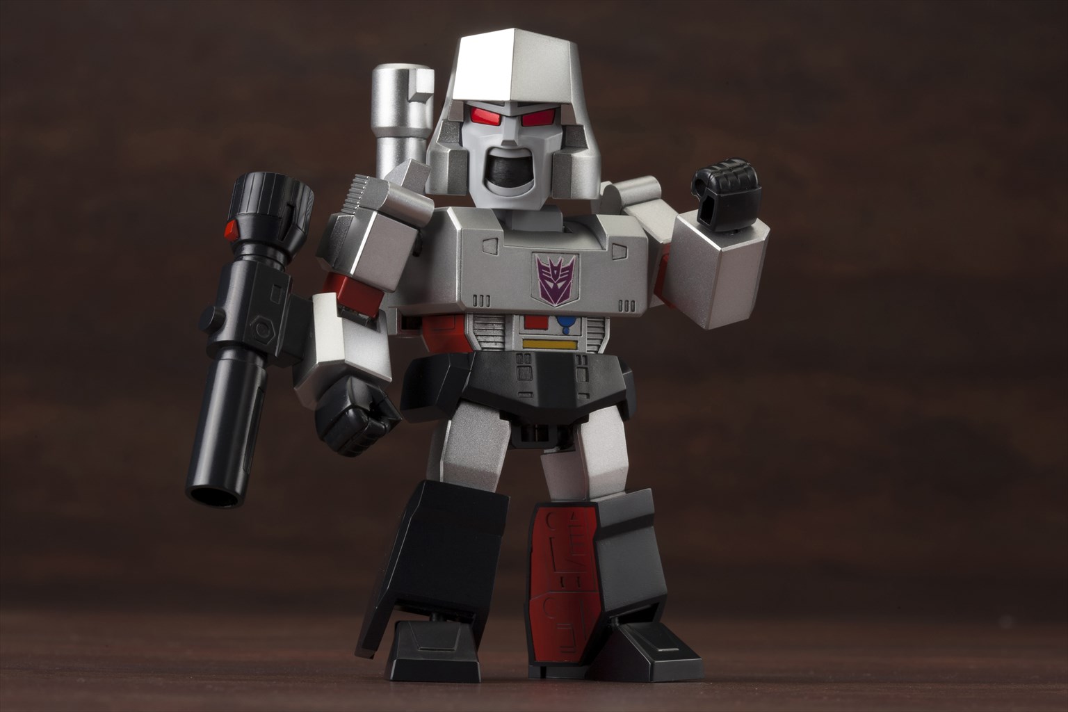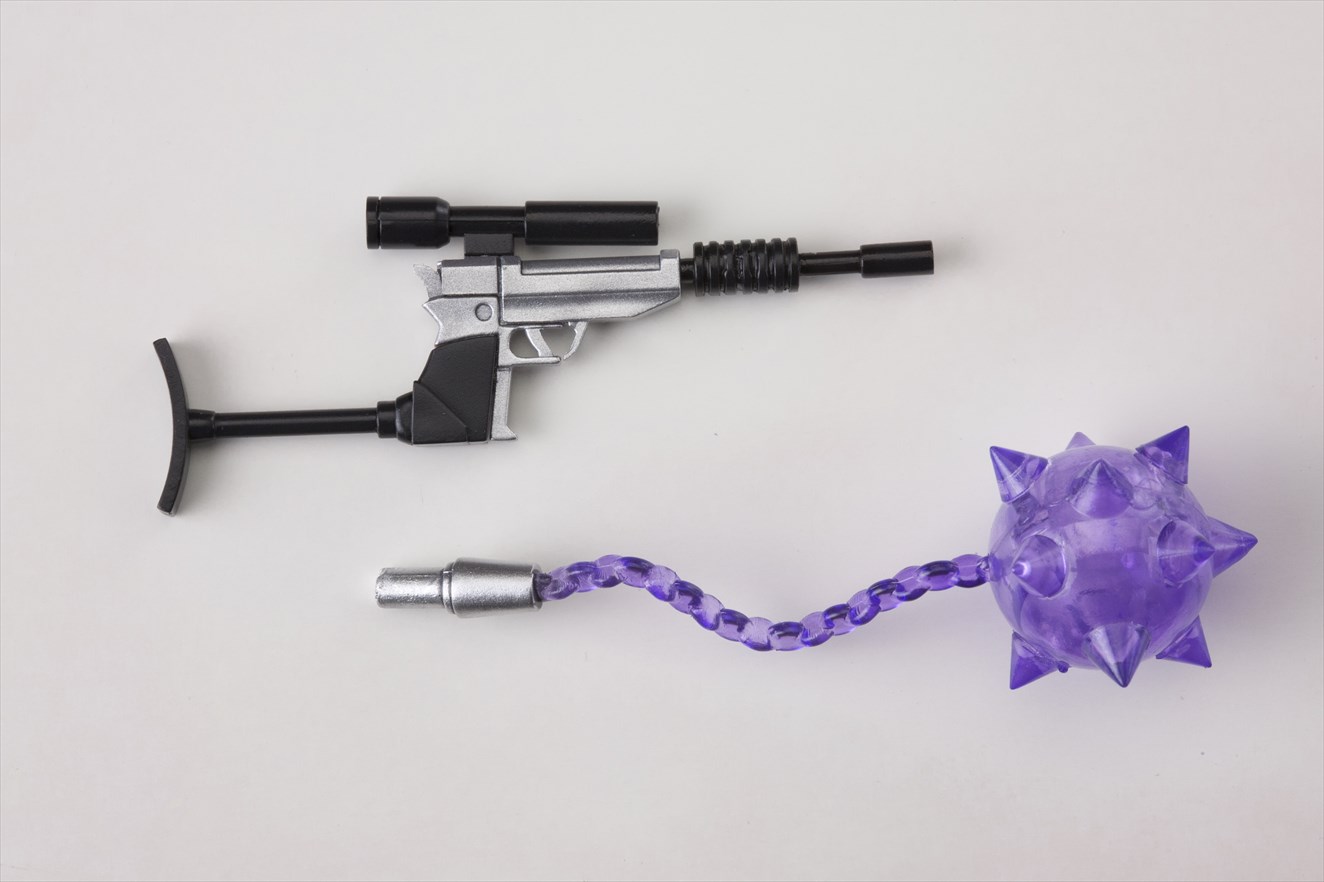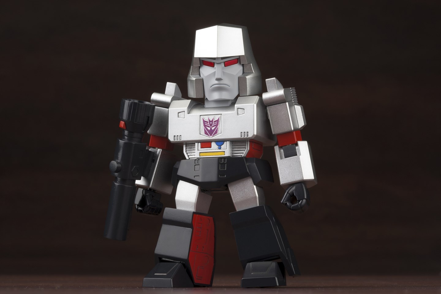 「コンボイ」同様、小さくかわいいサイズにアレンジしながらアニメイメージを損なうことなく立体化しました。通常の凛々しい顔の他に「スタースクリーム」に対して怒っている時の“叫び顔”や、悪巧みをしている時の“ニヤリ顔”など豊富な表情でお楽しみいただけます。さらにボディのメインカラーである銀部分は塗装済みの仕様につき、高級感のある仕上がりに。「メガトロン」の象徴的武器である「融合カノン砲」は設定画通りの取り付け方の他、可動を重視した取り付け方をお選びいただけます。「コンボイ」のエナジーアックスと対をなす「エナジーメイス」はクリアーパーツを採用、オープニングムービーでの決闘が再現できます。トランスフォーム後のガンモードが付属しているので「コンボイ」に持たせて共闘シーンを再現することも可能です。デストロンマークは付属のシールを貼ることで再現できます。「メカニカルベース フライング3」にも対応しているので様々なシチュエーションでディスプレイをお楽しみいただけます。