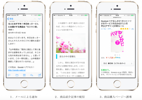 サービスの流れは以下の通りです。毎日、登録したメールアドレスに「今日のおすすめ商品とその紹介記事」をお届けします。ユーザーは推薦される商品とその記事を読み、気に入った商品を購入できます。このGoodsによって、毎日の生活に新しい発見が生まれ、革新的なショッピングを経験することができます。