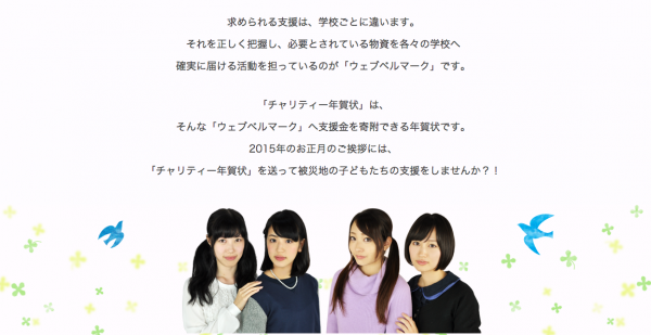 応募された作品より優秀作品を商品化し、「ネットで年賀状」にて販売、1枚購入いただくごとに10円をウェブベルマーク協会へ寄附し、被災地の小中学校に必要な備品、設備、教材などの購入に充てられます。