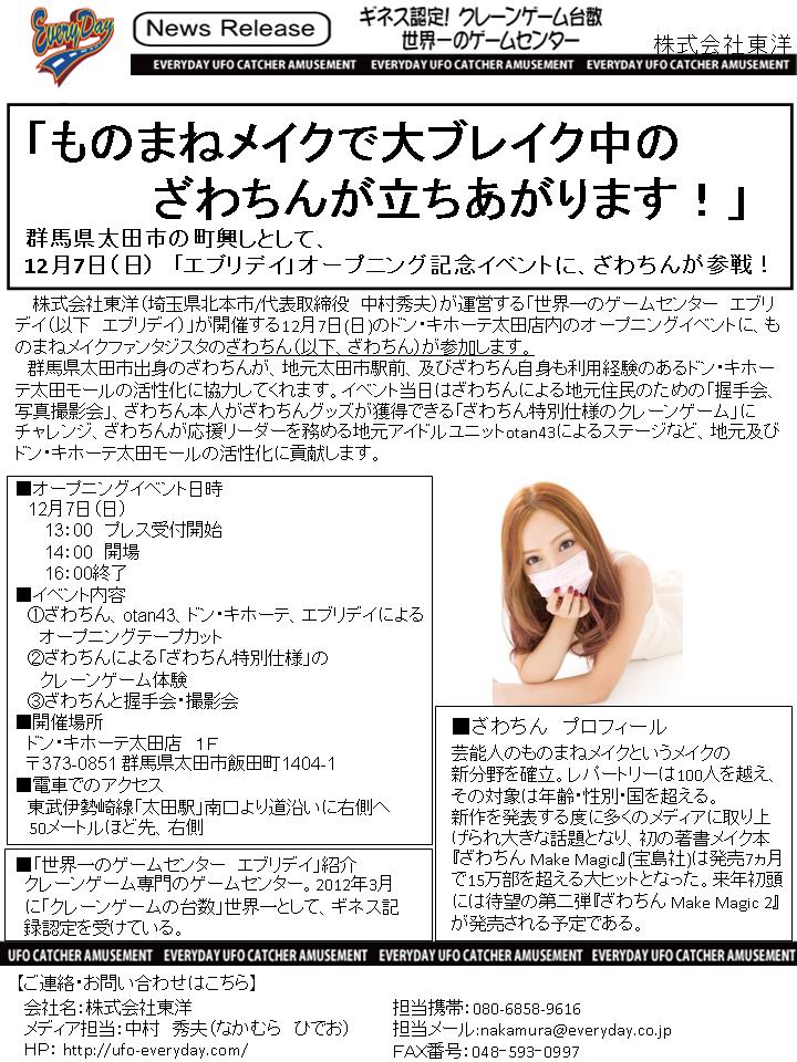 群馬県太田市出身のざわちんが、地元太田市駅前、及びざわちん自身も利用経験のあるドン・キホーテ太田モールの活性化に協力してくれます。イベント当日はざわちんによる地元住民のための「握手会、写真撮影会」、ざわちん本人がざわちんグッズが獲得できる「ざわちん特別仕様のクレーンゲーム」にチャレンジ、ざわちんが応援リーダーを務める地元アイドルユニットotan43によるステージなど、地元及びドン・キホーテ太田モールの活性化に貢献します。