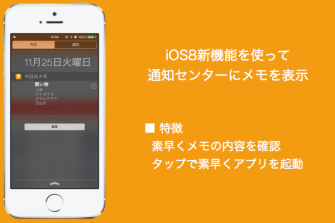メモの内容はiOS8の新機能を使って通知センターに表示することができ、素早く簡単に内容確認ができます。
