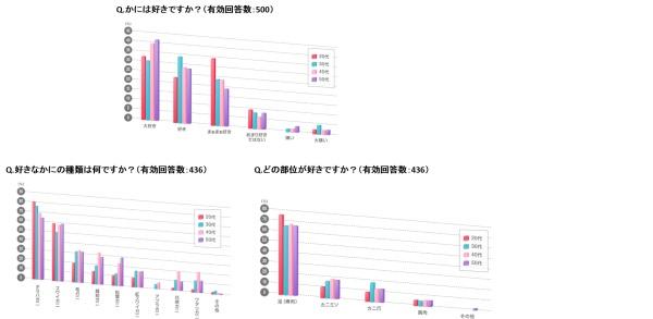 次に、好きなかにの種類と部位を聞いてみると、好きな種類では年代でそれほど差はみられず、1位タラバガニ、2位ズワイガニ、3位毛ガニという結果でした。