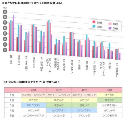 次に、好きなかに料理について伺いました。年代別では洋食の定番「カニクリームコロッケ」と、素材本来の味を楽しめる「ゆでカニ」、次いで、「焼きカニ」「カニグラタン」「カニしゃぶ」という順でした。ちなみに50代のカニクリームコロッケは、4位と5位の僅差で6位という結果でした。この辺りも、年代間で意見が分かれるようですね。