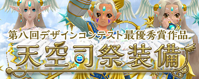 「天空司祭装備」は、第八回アイテムデザインコンテストでユーザー投票1位を獲得し、見事全身装備部門の最優秀賞に選ばれた装備です。