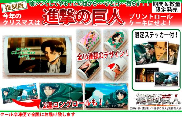 プリロールを運営する株式会社栄通(八王子市)は、諫山創原作の大人気漫画「進撃の巨人」クリスマス限定プリントロールケーキを2014年11月27日(木)に発売いたしました。