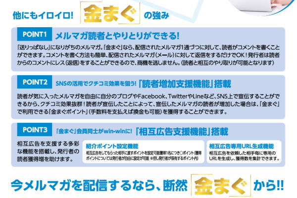 読者は宣伝したことによってメルマガの読者増加に寄与した場合、金まぐ内で利用出来る「金まぐポイント」を得ることが出来ます。