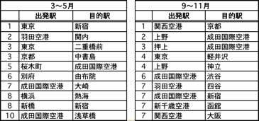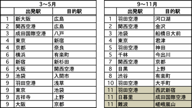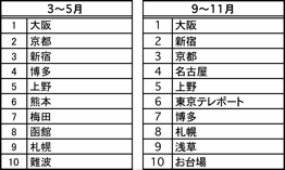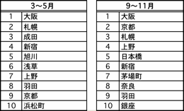新宿がいずれの時期にもベスト10に顔を出していて、ホテルが多いので、ここを拠点にする傾向だろう。