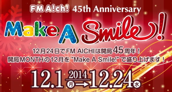 FM AICHIは2014年12月24日に民放FM Stationとして初めて開局45周年を迎えます。そこで、45年の感謝を込めて12月1日(月)~12月24日(水)の24日間「FM AICHI 45th Anniversary Make A Smile!」キャンペーンを行っていきます。