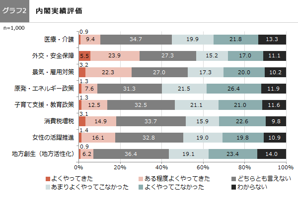 「医療・介護」「外交・安全保障」「景気・雇用対策」「原発・エネルギー政策」「子育て支援・教育政策」「消費税増税」「女性の活躍推進」「地方創生(地方活性化)」について、各政策の実績を5段階評価で問うと、非常に厳しい結果になりました。「外交・安全保障」だけは、肯定派29.4%(よくやってきた5.5%、ある程度よくやってきた23.9%)と否定派32.2%(あまりよくやってこなかった15.2%、よくやってこなかった17.0%)で賛否拮抗したものの、その他の7つの政策では、否定派が肯定派を大きく上回る結果になりました。