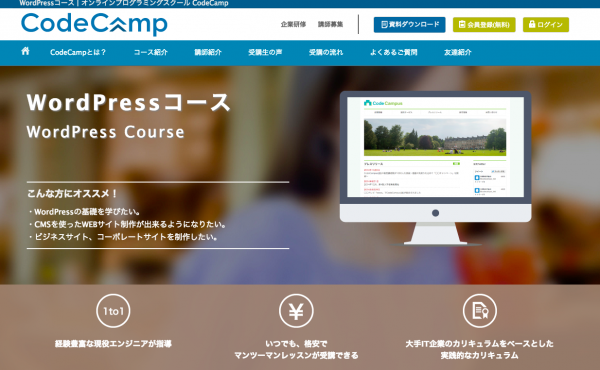 WordPressコースでは、WordPressの基本的な使い方を学びつつ、実際に企業のコーポレートサイトを制作します。最終的に、自分でWordPressを使ったコーポレートサイトのような、基本的なWEBサイト制作ができるようになっていただき、さらに実際のレンタルサーバーで、そのサイトを公開することができるようになっていただきます。