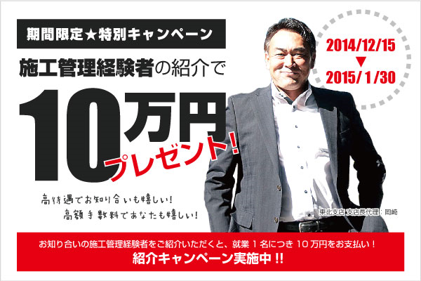 通常の紹介キャンペーンでは、1名につき5万円をプレゼントしておりますが、2014年12月15日から2015年1月30日までの間は、その2倍となる10万円の謝礼をお支払いします。