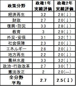 認定NPO法人 言論NPO(東京都中央区日本橋、代表:工藤泰志)は、12月14日投開票の衆議院選挙に向け、安倍政権の2年時点における「政権実績評価」を行い、その結果を12月1日に発表いたしました。総合評価は5点満点中2.5点となり、昨年実施した安倍政権1年時点での総合評価2.7点より、0.2ポイント下がりました。アベノミクスで注目される「経済再生」の分野は、現時点で成果を判断できないことが点数を押し下げ、昨年の3.2点から、今年は2.8点に下がりました。