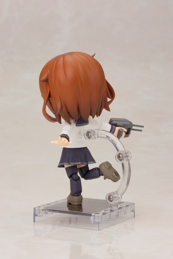 「キューポッシュ」とは、2.3頭身のデフォルメ可動フィギュアシリーズ、小さな体ながらも「首・肩・肘・手首・腰・股・膝・足首」の豊富な可動域と足裏のマグネットにより専用ベースの上では楽々といろんなポーズがとることができます。背中の艤装もキャラクターに合わせてデフォルメ化。キューポッシュ独自仕様として連装砲は分離して手に持たせることも可能。表情パーツ3種類、差替え用手首も付属するため、お好みのポーズで飾る事ができます。