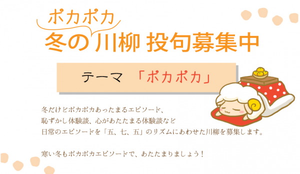 冬のぽかぽかに関わる、「ココロがあたたまる体験段」「女性の恥ずかしい体験」「大笑いしてしまった体験談」面白い・笑い・感動・哀愁など日常のエピソードを「5・7・5」の合計17文字以上のリズムにのせた川柳作品(字あまり、字足らずの作品も可)を募集。