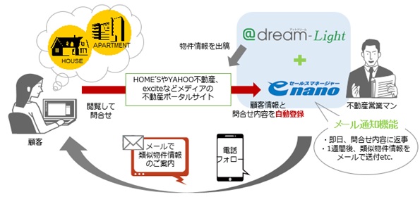 このシステムでは、まず「@dream-Light」を使うことで物件情報の管理、ホームページの作成、不動産ポータルへの出稿が行えます。ここで作成されたホームページや不動産ポータルにおいて顧客が問合せを行った際、顧客情報や問合せ内容が「eセールスマネージャーnano」に自動的に登録されます。不動産営業マンは、自動登録された問合せに対して即時電話やメールでのフォロー、類似不動産情報の紹介などを行うことができます。これにより、素早くきめ細やかな顧客対応が可能となり、新規顧客の獲得を強力にサポートします。