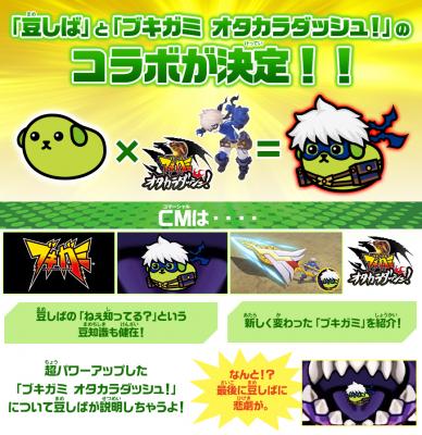「豆しば」と「ブキガミ オタカラダッシュ!」のコラボが決定! 2008年にテレビCMでデビューし、「ねぇ知ってる?」でお馴染みの、豆でもなく、犬でもない不思議な生きもの「豆しば」が、キッズアミューズメントマシン「ブキガミ」が2014年11月29日(土)に超パワーアップして「ブキガミ オタカラダッシュ!」として生まれ変わることを記念したコラボCMを12月中旬からオンエアすることになりました。