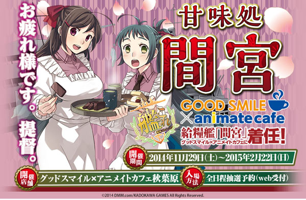 2015年1月からTVアニメも開始する『艦隊これくしょん~艦これ~』とグッドスマイル×アニメイトカフェ秋葉原のコラボレーションが決定いたしました。作中にも登場する『甘味処 間宮』という名称で、2014年11月29日(土)~2015年2月22日(日)までの期間中、東京・秋葉原にあるグッドスマイル×アニメイトカフェで開催されます。