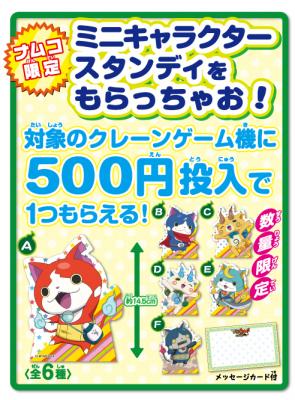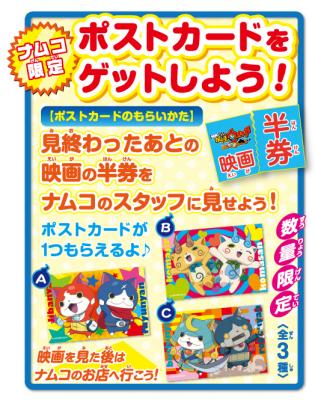 キャンペーン期間中、映画「妖怪ウォッチ」観賞済み前売券または、映画半券と引き換えで、「ナムコ限定ポストカード」(全3種)を1枚プレゼント致します。