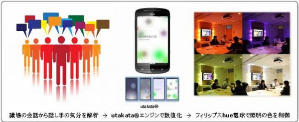 「utakata(R) mood-light (ウタカタ(R)・ムードライト)」は、フィリップス社製hueのAPIを利用し、照明の色を会話の気分に合わせて変化させます。 会話中盛り上がった瞬間には、暖色系(赤やオレンジ、黄色)に照明の色が変化。 逆に気分が下がると寒色系(青色)に照明の色が増えてきます。